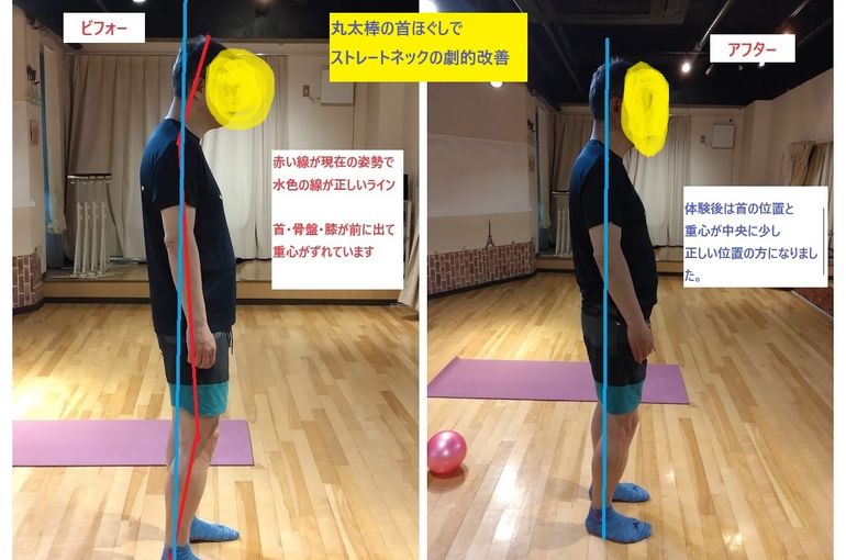 体験前には、顎が前に出ていて重心全体が前に行っていました。